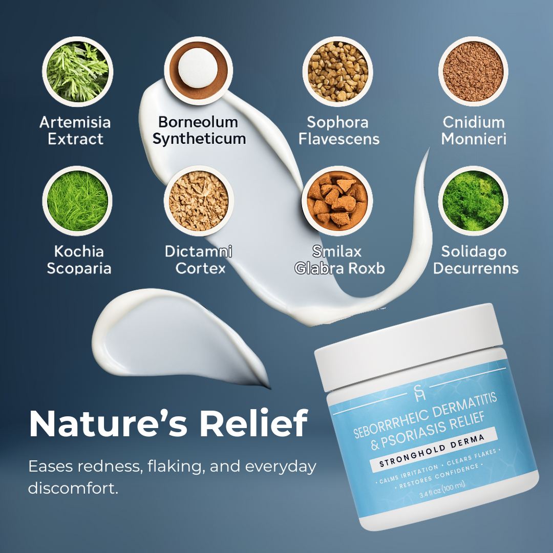 Stronghold Seborrheic Dermatitis & Psoriasis Cream is designed for skin that struggles with persistent flakes, redness, and irritation. Powered by 9 potent botanicals — including Smilax, Artemisia, and Dictamni Cortex — it helps reduce stubborn buildup, calm flare-ups, and restore your skin’s natural barrier.